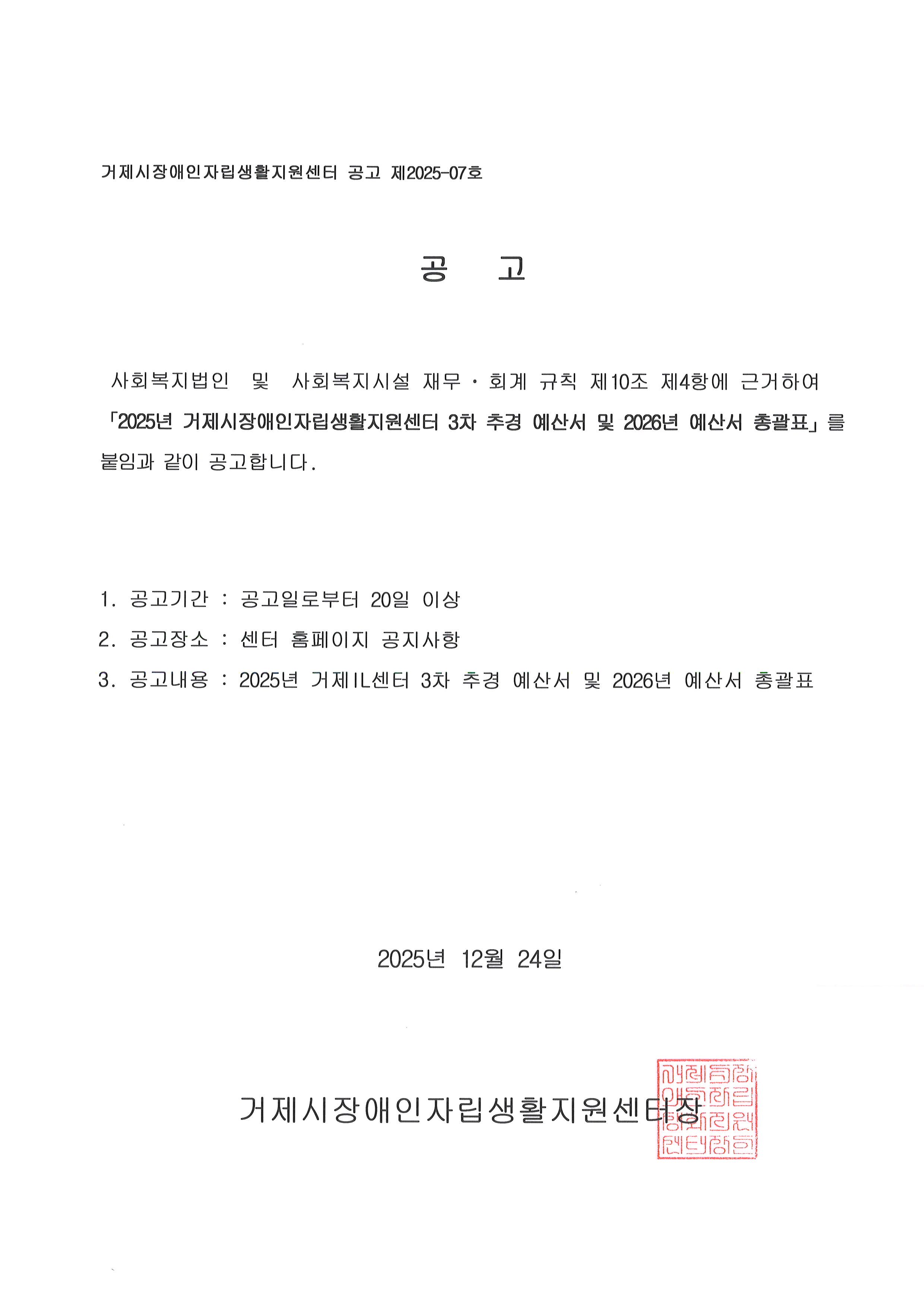 2025년 거제시장애인자립생활지원세터 3차 추경 예산서 및 2026년 예산서 공고 최고관리자 0 3 3시간전 2025.12.29 16:25 2025년 거제시장애인자립생활지원센터 3차 추경 예산서 및 2026년 예산 총괄표..pdf (262.3K) + 0